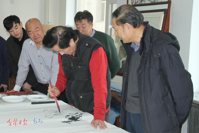 著名画家易洪斌为笔会开笔 3月的风,和煦轻柔,吹面不寒,省政协书画院里嘉宾云集。王云坤、易洪斌、吴文昌、蒋力华、张福有、潘占学、沈鹏云、曹和平、金中浩、李铁龙、张大光、张建华、朱辰、黄坚等艺术家们兴致高昂,挥毫泼墨,点染丹青,诗词唱和,画室里洋溢着一派浓浓的春天气息。著名画家易洪斌首开笔墨,一会儿工夫,五只可爱的小猪就跃然纸上。紧接着,朱辰、张大光画了鸡鸭、孩童和葫芦,张建华为画面添上篱笆。再经整理着色,王云坤高兴地给画题上“纳福大吉图”,众画家题名钤印,一幅8尺整张的农家乐图大功告成。 纳福大吉图